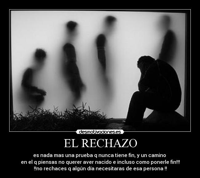 Y como estos rechazos también hay muchos mas sin embargo tenemos que recordar que el rechazo es algo muy malo y a la vez bueno , el rechazo es bueno solo si se desprecia algún delito pero en su mayoría es malo porque no hay nada mas feo que despreciar a una persona y tratarlo como basura por su color de piel , creencia religiosa, descendencia u otros factores , pero también rechazar a alguien por no amarlo y mostrar un desprecio.